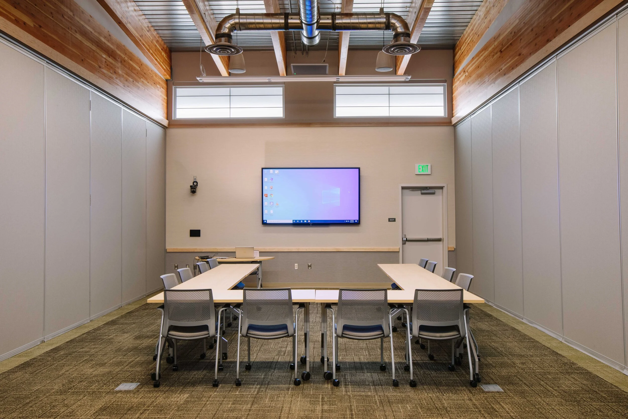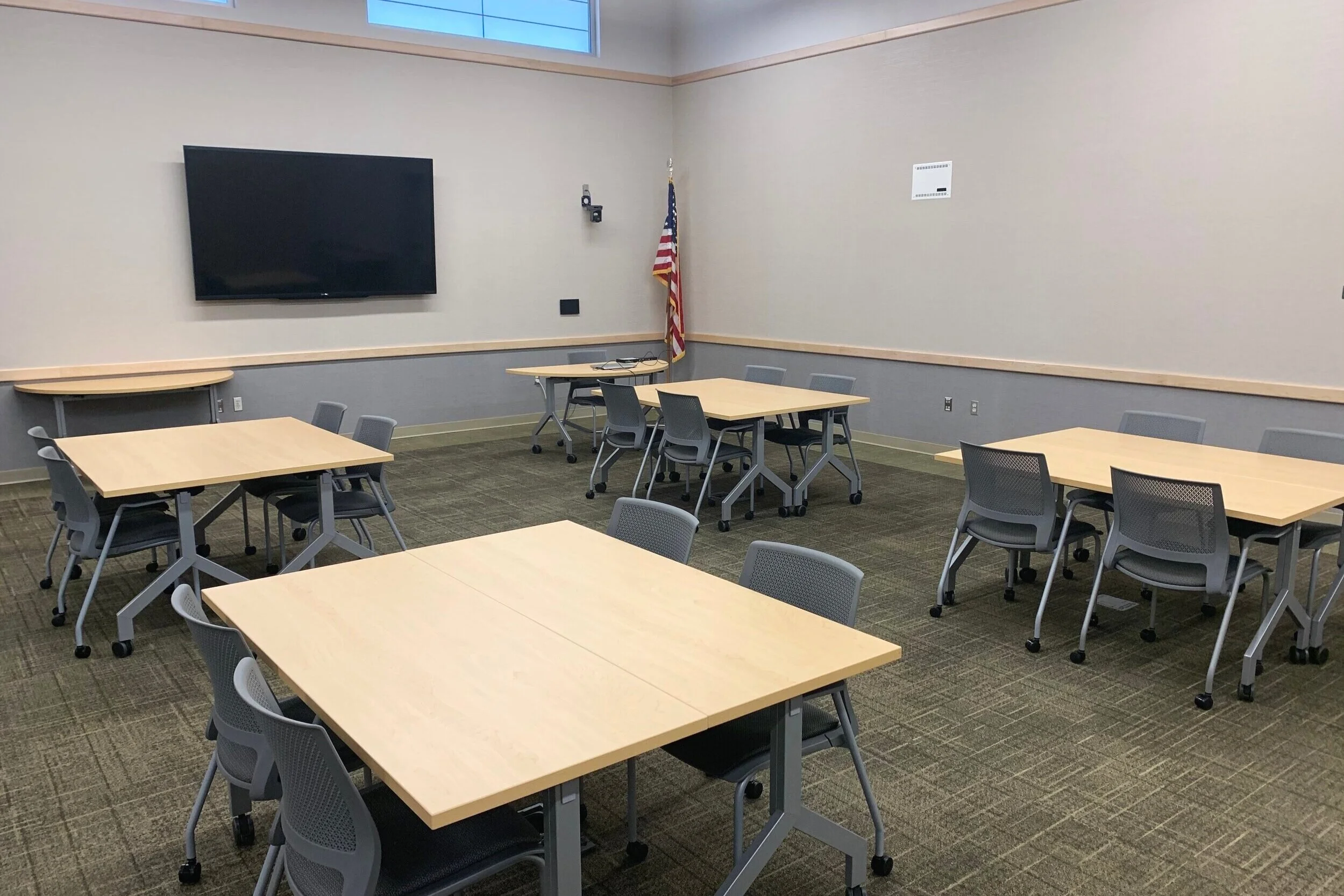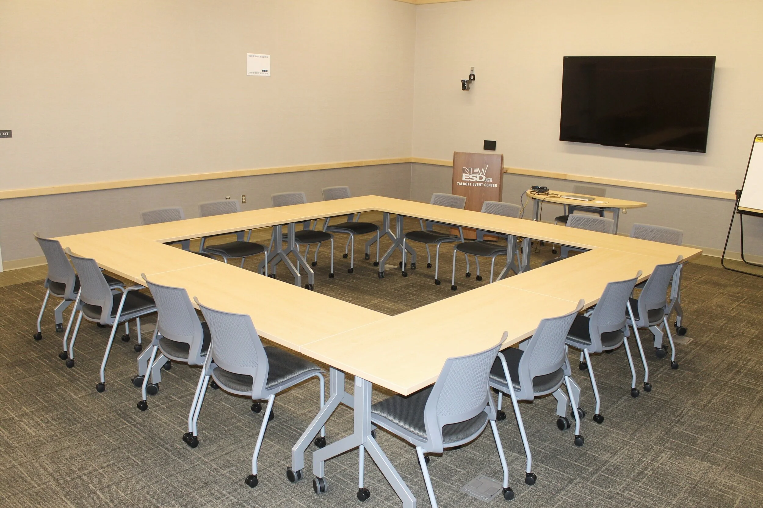 Features: Ceiling mounted speakers and room microphones, wall mounted cameras, 90” wall mounted monitor, windows laptop, slide advancer (clicker). All technology works seamlessly with Zoom and most other video conferencing programs. Power outlets in the floor throughout the room. Lapel mic, handheld mic, second computer monitor for laptop, podium, and easel white board available upon request. Coffee is in the kitchenette across the hallway, or available directly outside the room upon request.