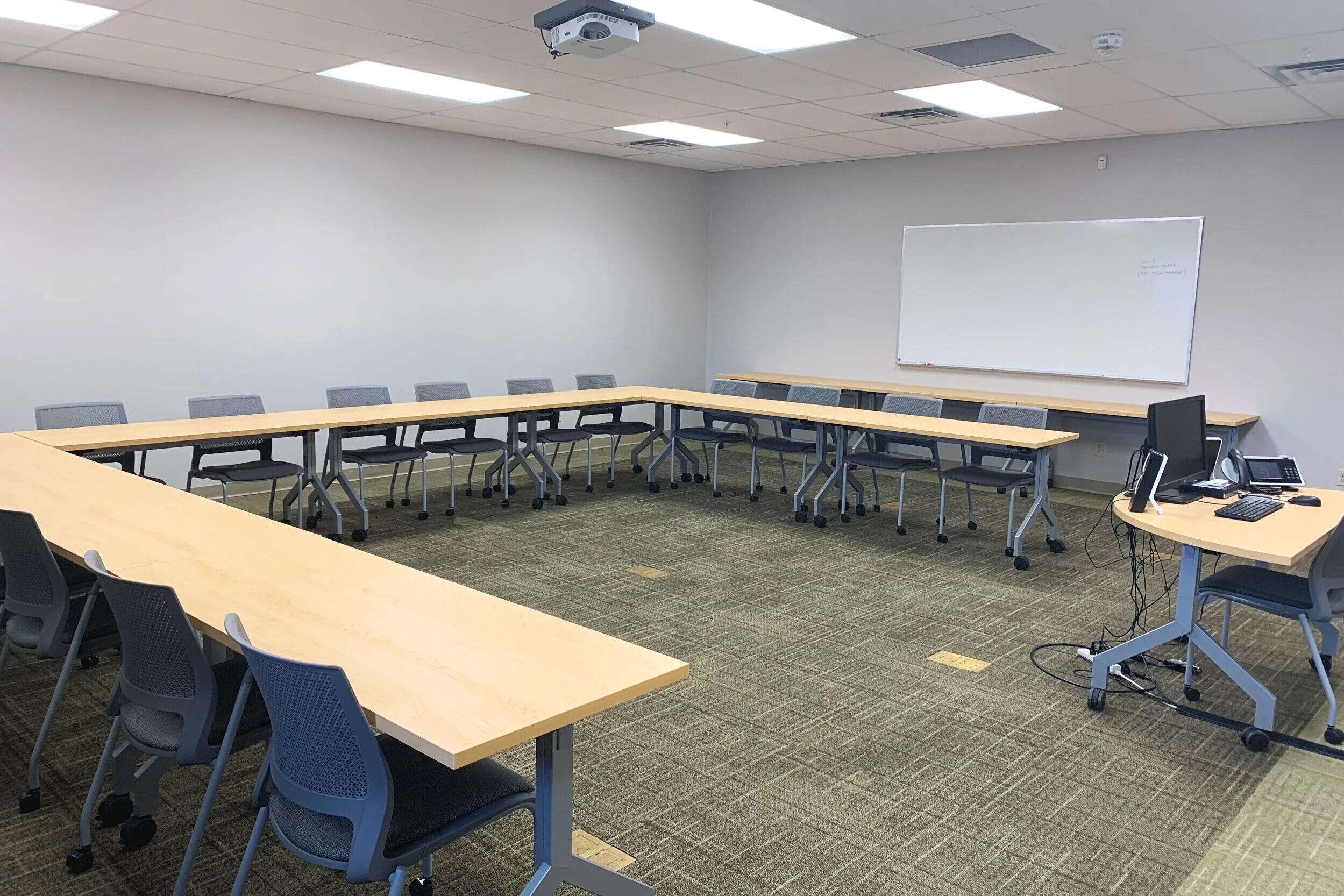 Features: Windows desktop computer, ceiling-mounted projector, PA system, handheld mic, lapel mic, podium, easel white board, slide advancer (clicker), and kitchenette. Handheld microphones can be used with Zoom or other video conferencing software, and a webcam is available upon request. Coffee station located directly outside the room.