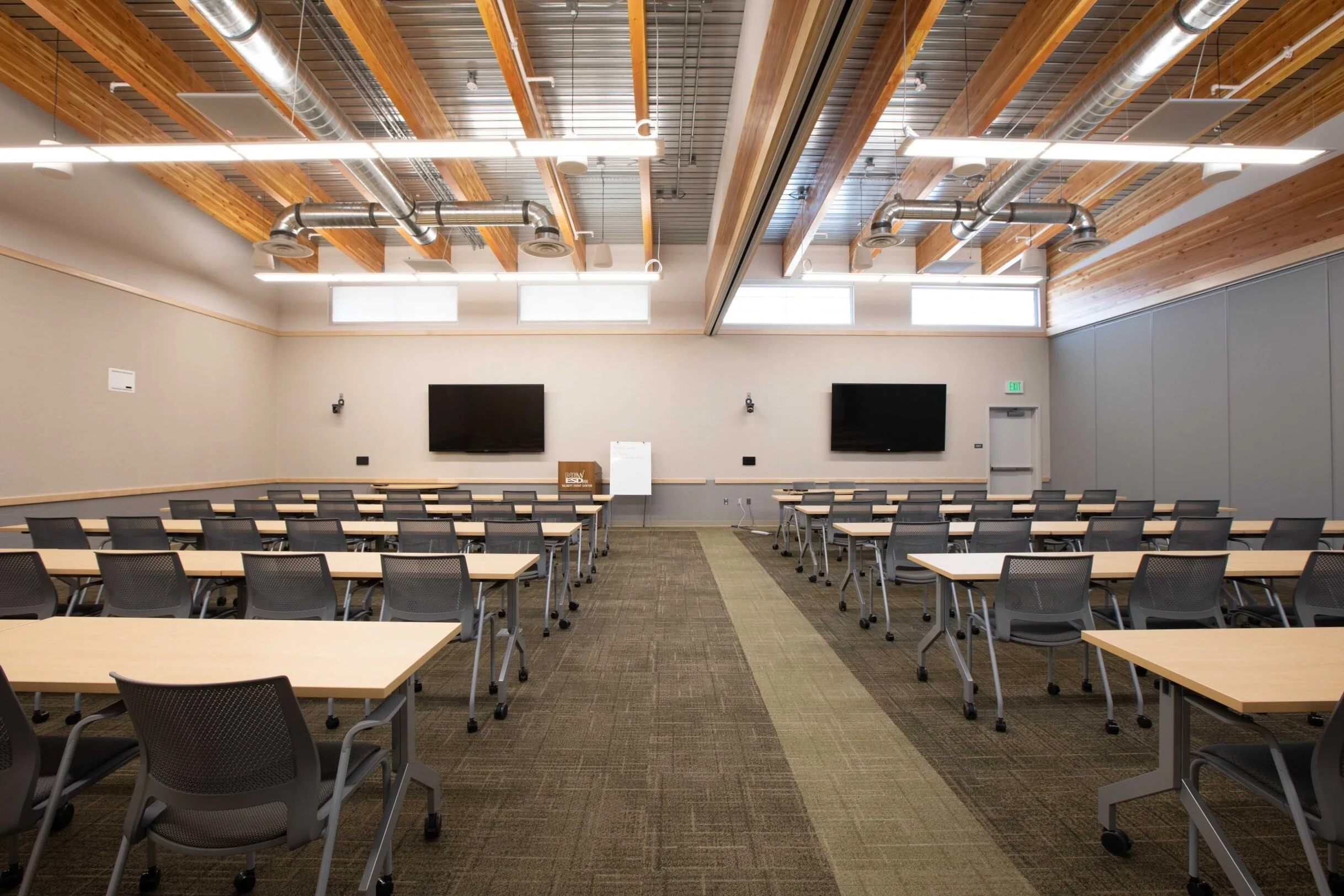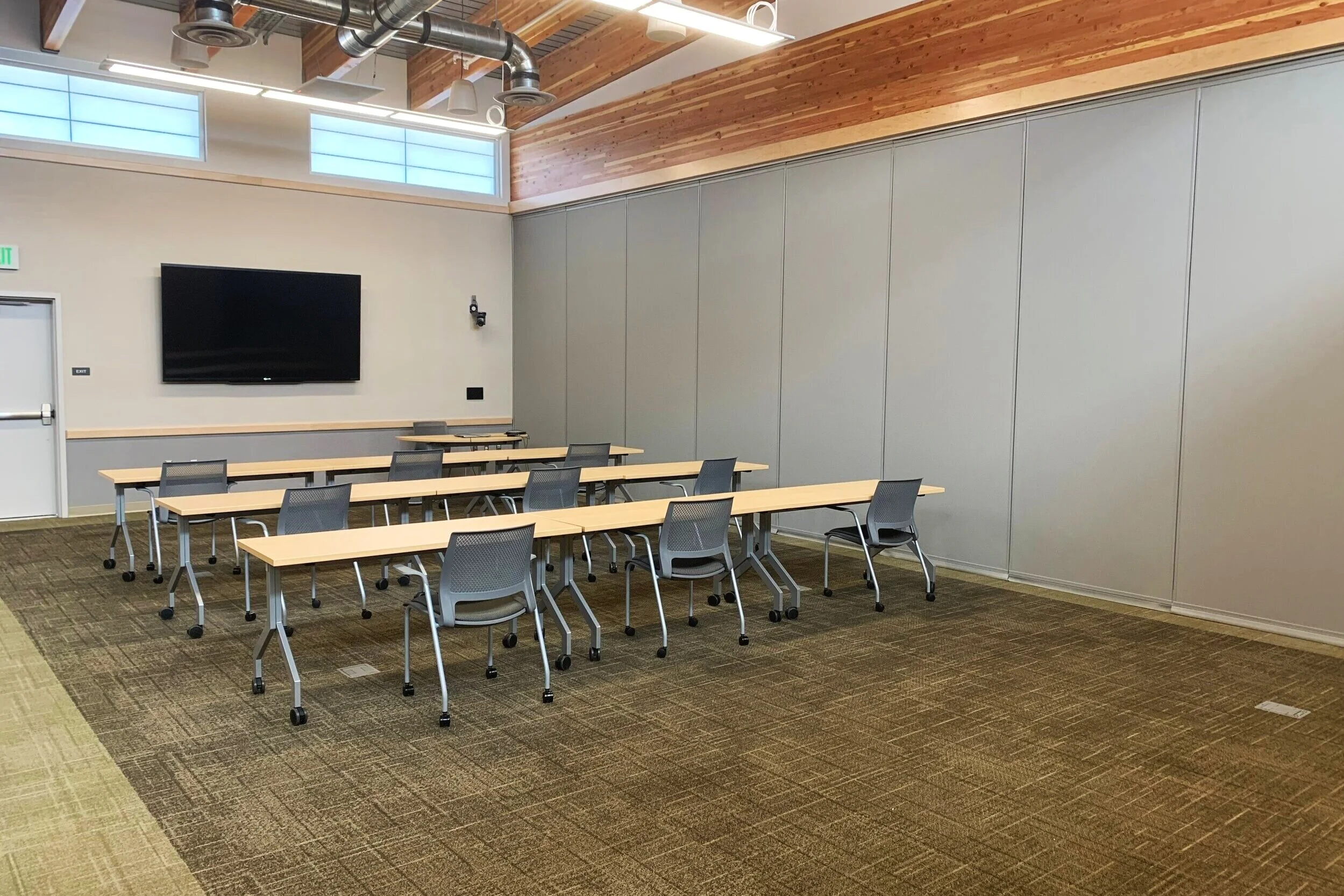 Room combinations feature: Ceiling mounted speakers and room microphones, wall mounted cameras, 90” wall mounted monitor, windows laptop, slide advancer (clicker). All technology works seamlessly with Zoom and most other video conferencing programs. Power outlets in the floor throughout the room. Lapel mic and handheld microphone quantity available depends on the number of rooms combined. Second computer monitor for laptop, podium, and easel white board available upon request. Coffee is in the kitchenette across the hallway, or available directly outside the room upon request. Large events of 80+ people will receive coffee directly outside the room per default.